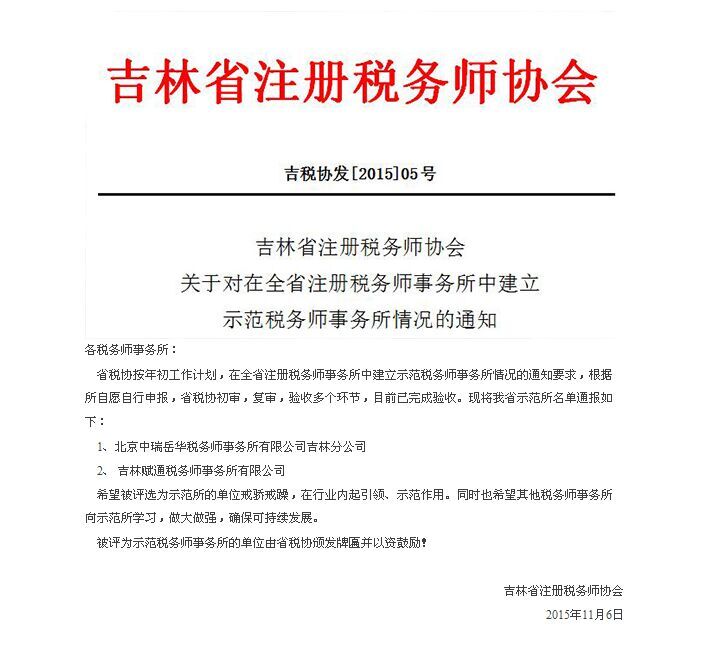中瑞岳华吉林被吉林省税务师协会评为“省级示范税务师事务所”!