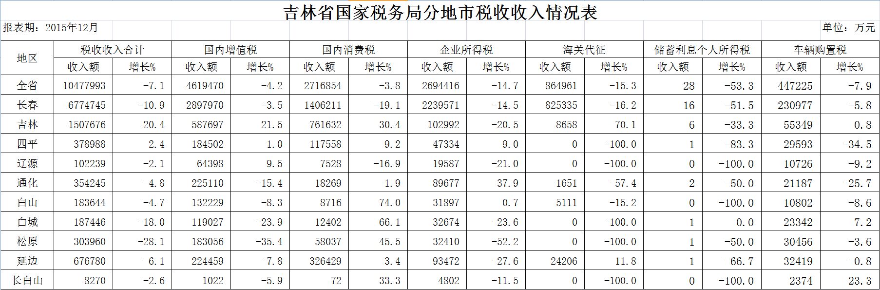 吉林省国家税务局2015年税收收入情况